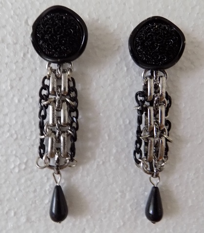 se vzorem, náušnice jsou vyrobeny z bižuterního kovu pokrytého vrstvou patiny, kombinace černé a stříbrné, pro denní nošení i do společnosti, zapínání na kolík a silikonovou koncovku
