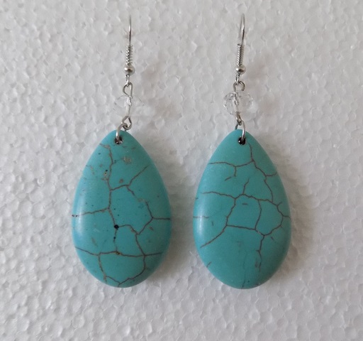 náušnice dlouhé, visací, antik styl, velký kámen tyrkysové barvy a korálek bílé barvy, zapínání na africké háčky stříbrné barvy