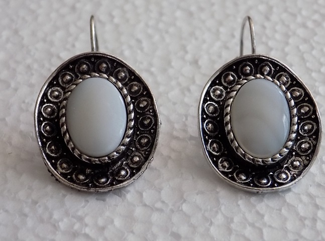 stříbrná barva, náušnice visací z patinovaného kovu, antik styl, velký kámen bílé barvy, zapínání na klasický patent