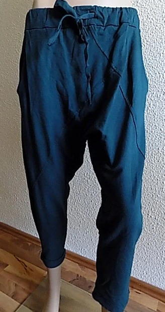 V pase pružná guma se šňůrkou na stažení, pas velmi pružný, nízký sed, ozdobné aplikace, boční hluboké kapsy, zadní našívané kapsy, nohavice dole rovné lze nosit ohrnuté.