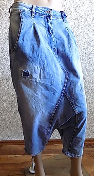 Světle modré, vyšisované, velmi hluboký sed, v pase zip a knoflík, přední a zadní kapsy, kalhoty mírně pružné, velmi krásné a kvalitní džíny, délka 7/8.